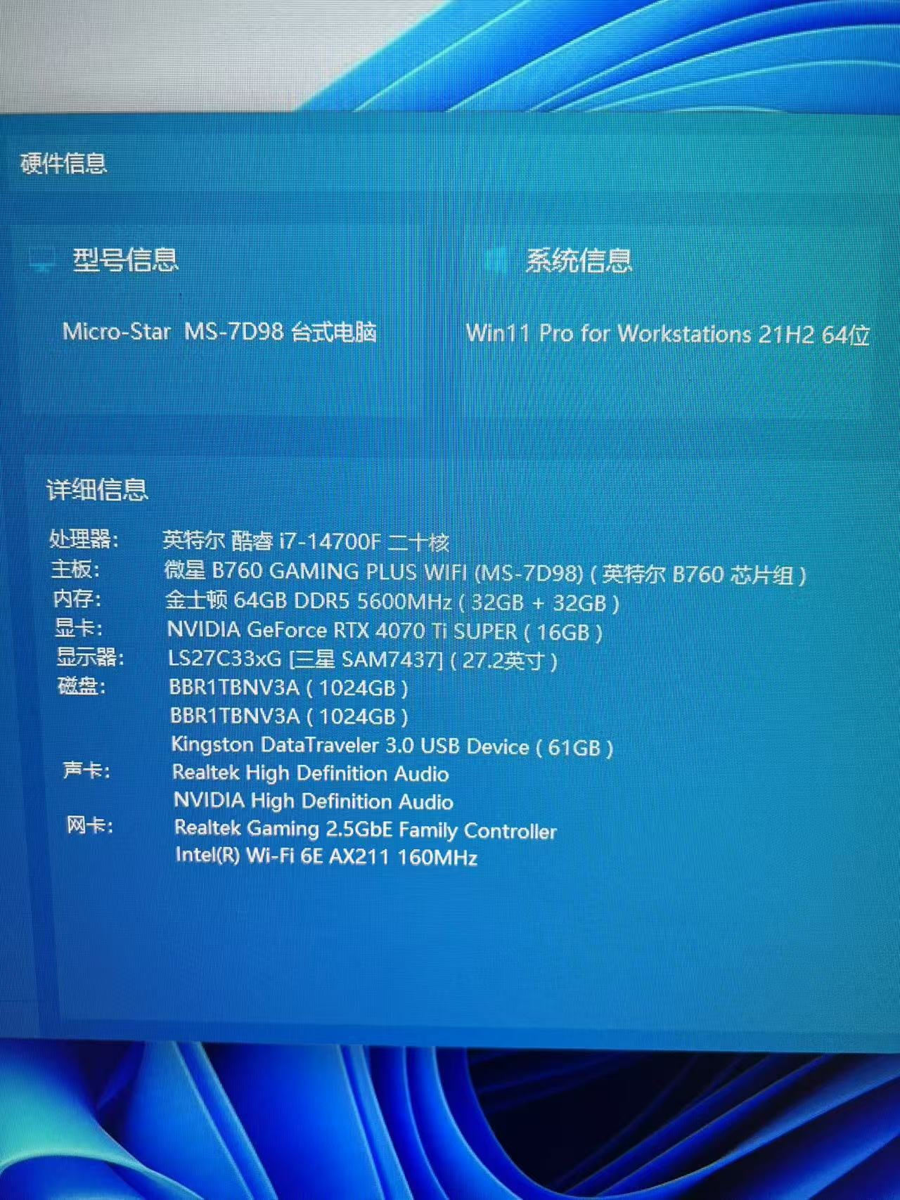 酷睿i7-14700F二十核 DDR5 64G 硬盘M.2 1TB 微星B760 GeForce RTX 4070 T SUPER游戏显卡