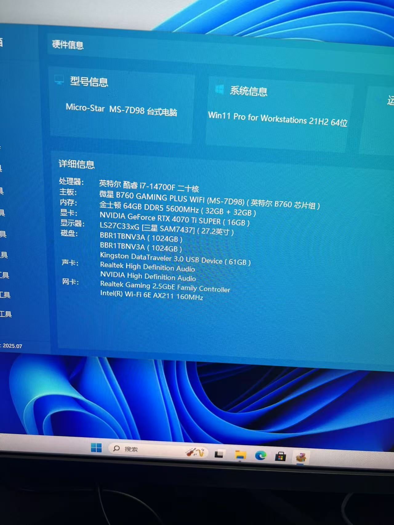 内存: 金士顿 64GB DDR5 5600MHz(32GB +32GB)